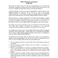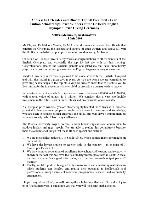 Address to delegates and Rhodes Top 50 Free First -Year Tuition Scholarships Prize Winners at the De Beers English Olympiad Prize Giving Ceremony