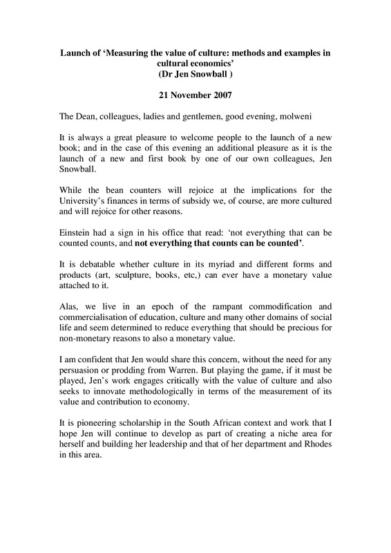 Launch of Measuring the value of culture: methods and examples in cultural economics (by) Dr Jen Snowball