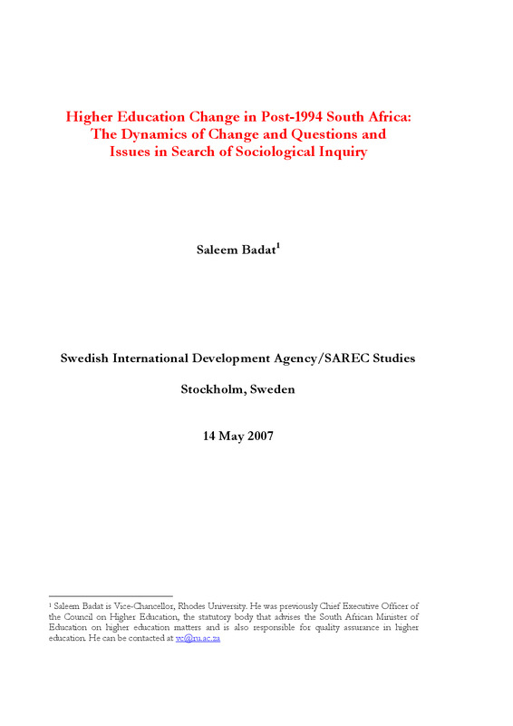 Higher Education change in post-1994 South Africa : the dynamics of change and questions and issues in search of sociological inquiry