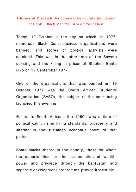 Address at Dispatch Dialogues/Biko Foundation Launch of Book: Black Man You Are on Your Own
