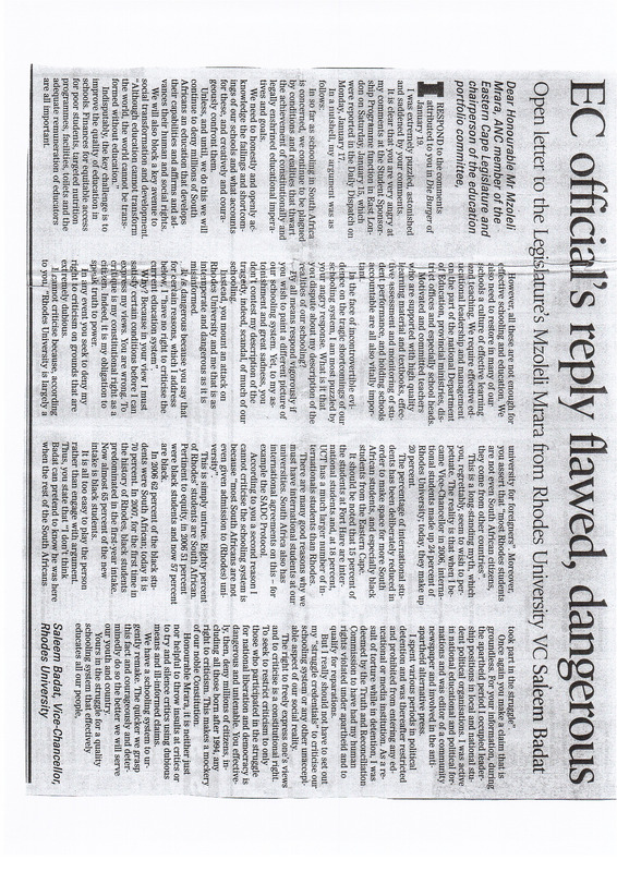 Badat, Saleem, “EC official's reply flawed, dangerous : open letter to the Legislature's Mzoleli Mrara from Rhodes University VC Saleem Badat”, Cory Library and Historical Archives, accessed 31 December 2025, https://digitalarchives.ru.ac.za/s/cory/item/16203