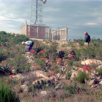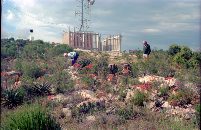 - Showing typical vegetation. Coral aloe, A. striata in good flower. Police radio mast on summit beside trig-beacon.