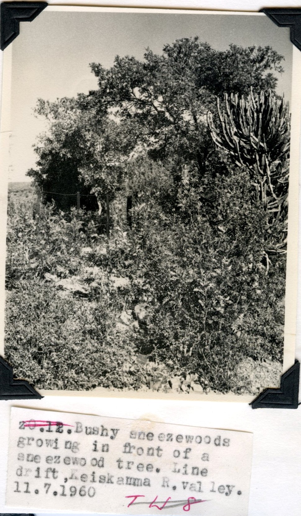 - Caption "Bushy sneezewoods growing in front of a sneezewood tree. Line drift, Keiskamma R. valley. 11.07.1960."