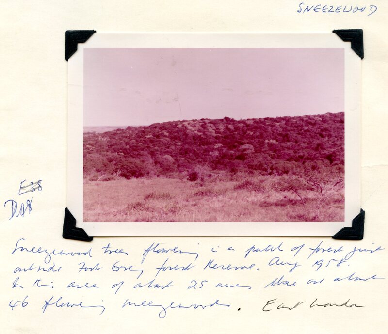 - Caption "Sneezewood tree flowering in a spatial forest just outside Fort Grey forest Reserve. Aug 1958. In this area of about 25 acres there are about 46 flowering sneezewoods. East London."
