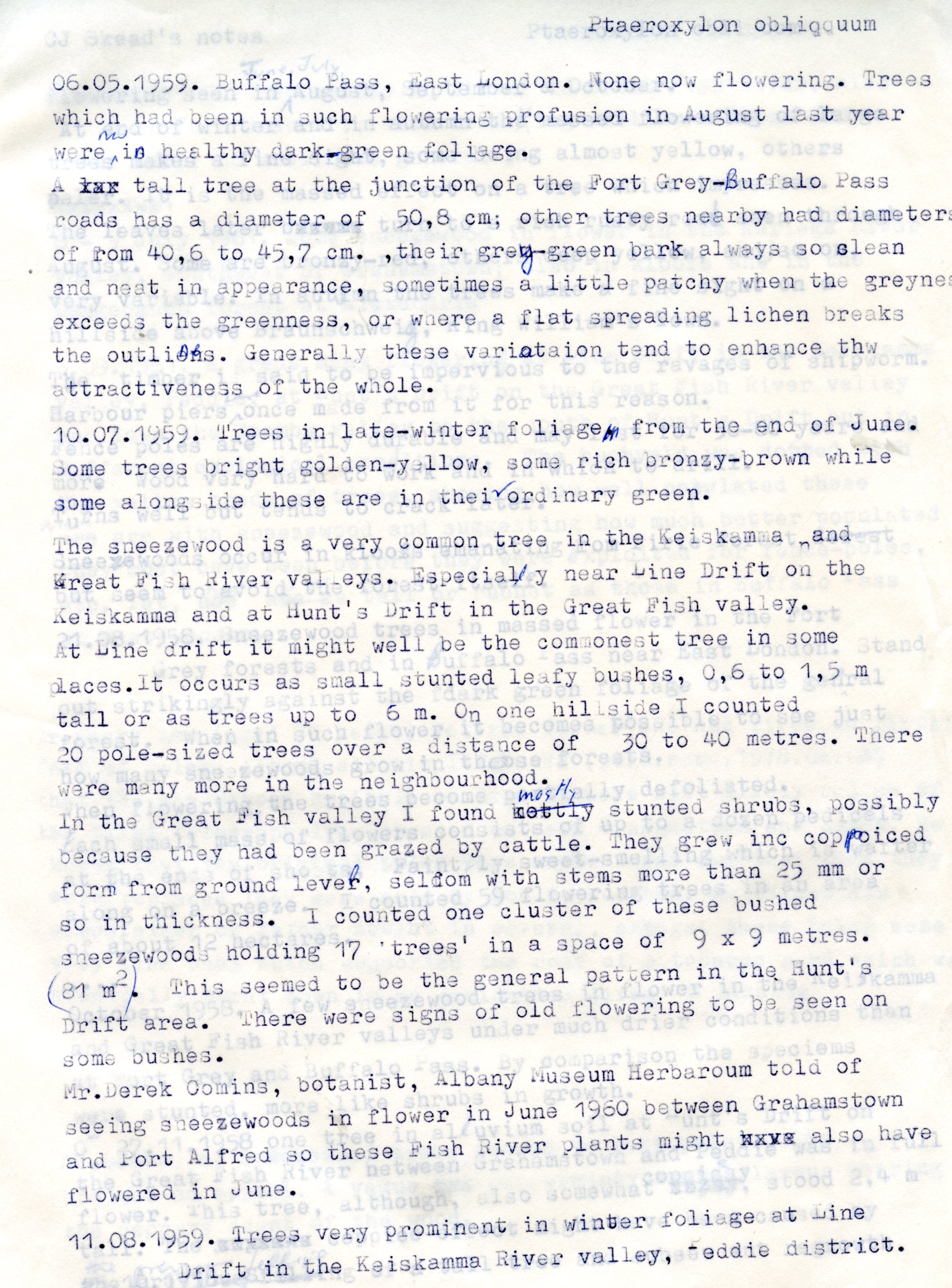 - Caption "C. J. Skead's notes. Ptaeroxylon obliquum. 1959."