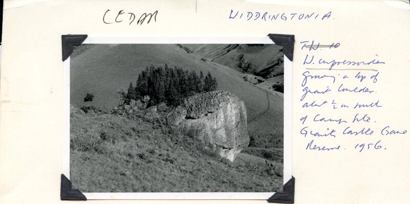 - Caption: "W. cupressoides growing on top of granite boulder about 1/2 south of camp site. Giant's Castle Came Reserve 1956."