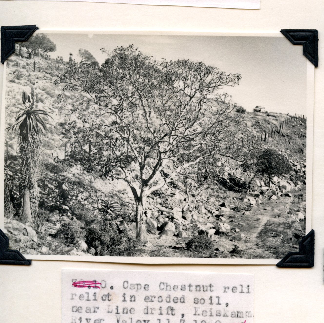 - Caption: "Cape Chestnut relict in eroded soil, near Line drift, Keiskamma River Valley. 11.7.1960."