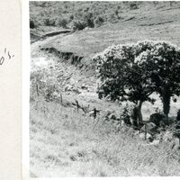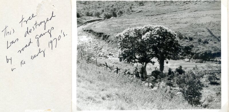 - Caption: "Cape Chestnut beside the National Road near Line Drift, Keiskamma River, King William's Town. Note how the tree is growing alone, yet it is a tree which normally likes to have others growing around it. The veld has been denuded of its dense valley bush along the stream. 1964." Additional handwritten note: "This tree was destroyed by road gangs in the early 1970's."