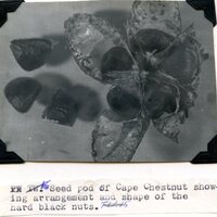 - Caption: "Seed pod of Cape Chestnut showing arrangement and shape of the hard black nuts."