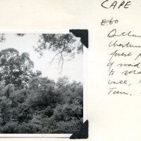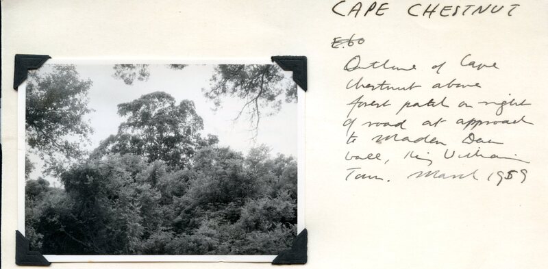 - Caption: "Outline of Cape Chestnut above forest patch on right of road at approach to Maden Dam Wall, King William's Town. March 1959."