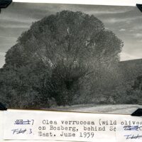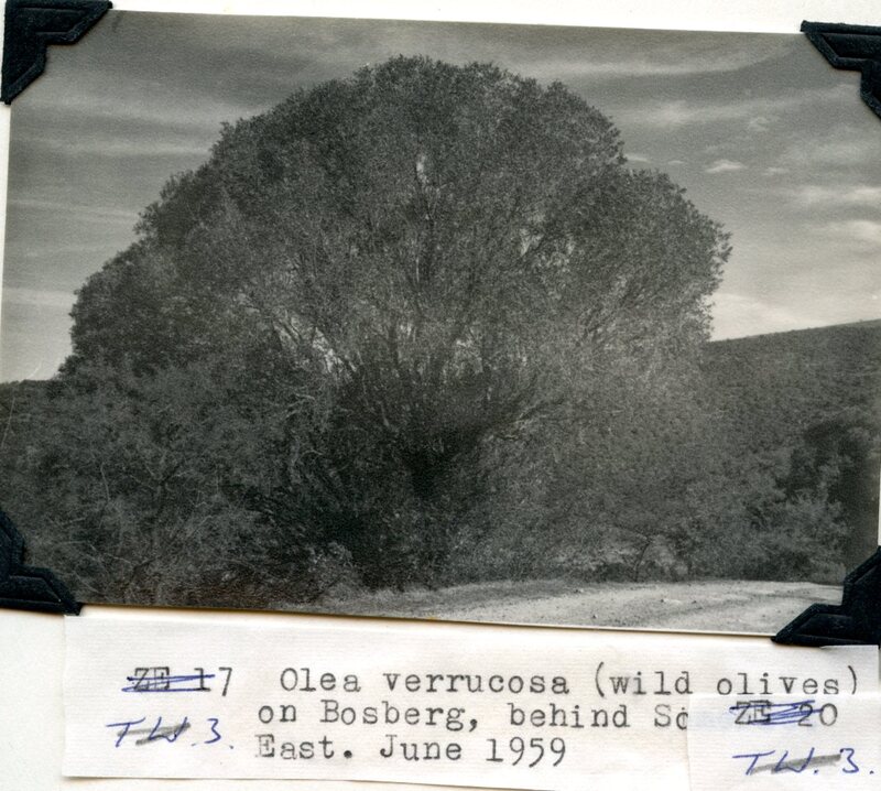 - Caption: "Olea verrucosa (wild olives) on Bosberg, behind Somerset East. June 1959."
