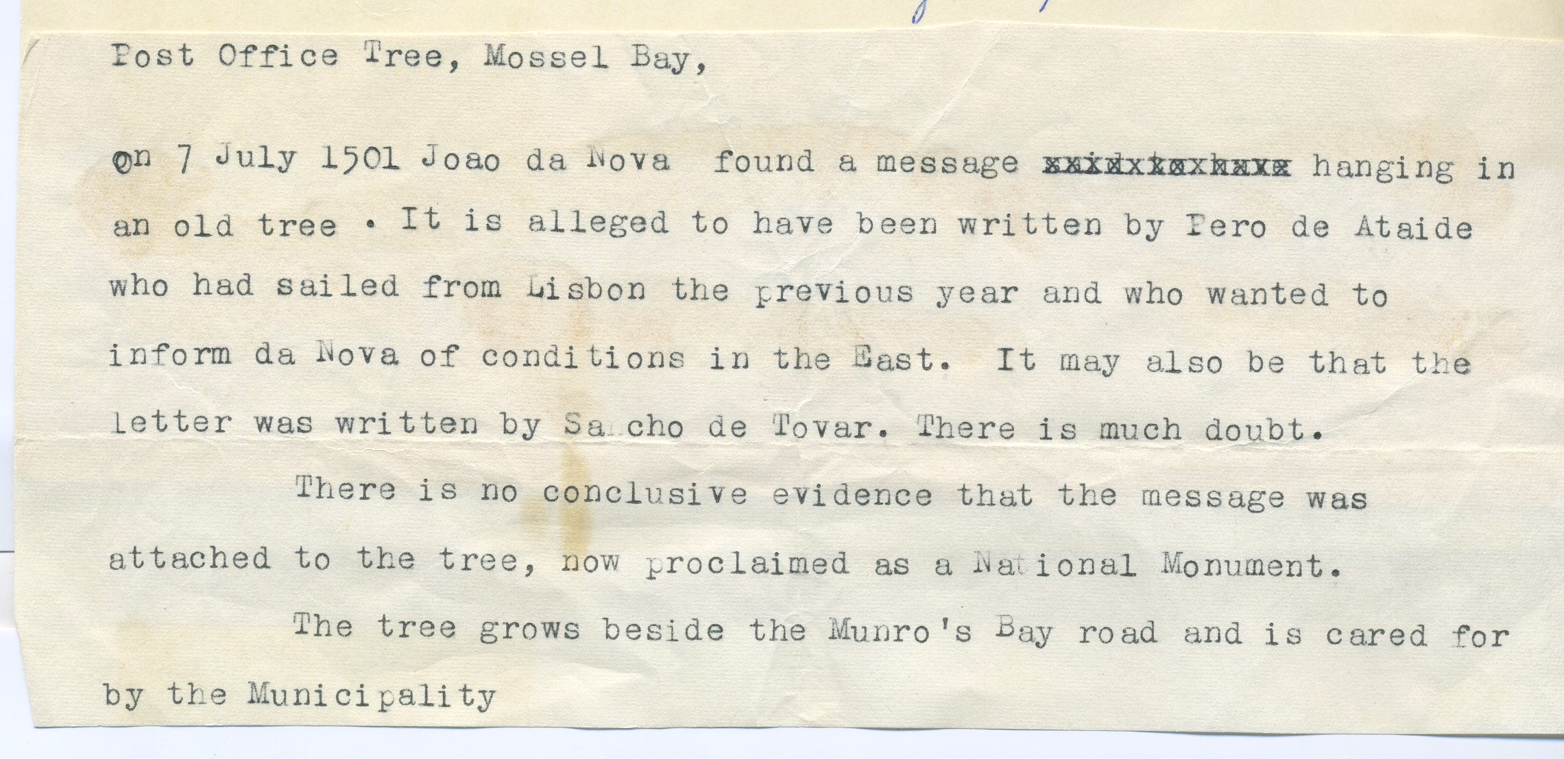 - Caption "Post Office Tree, Mossel Bay. Grows by Munro's Bay road."