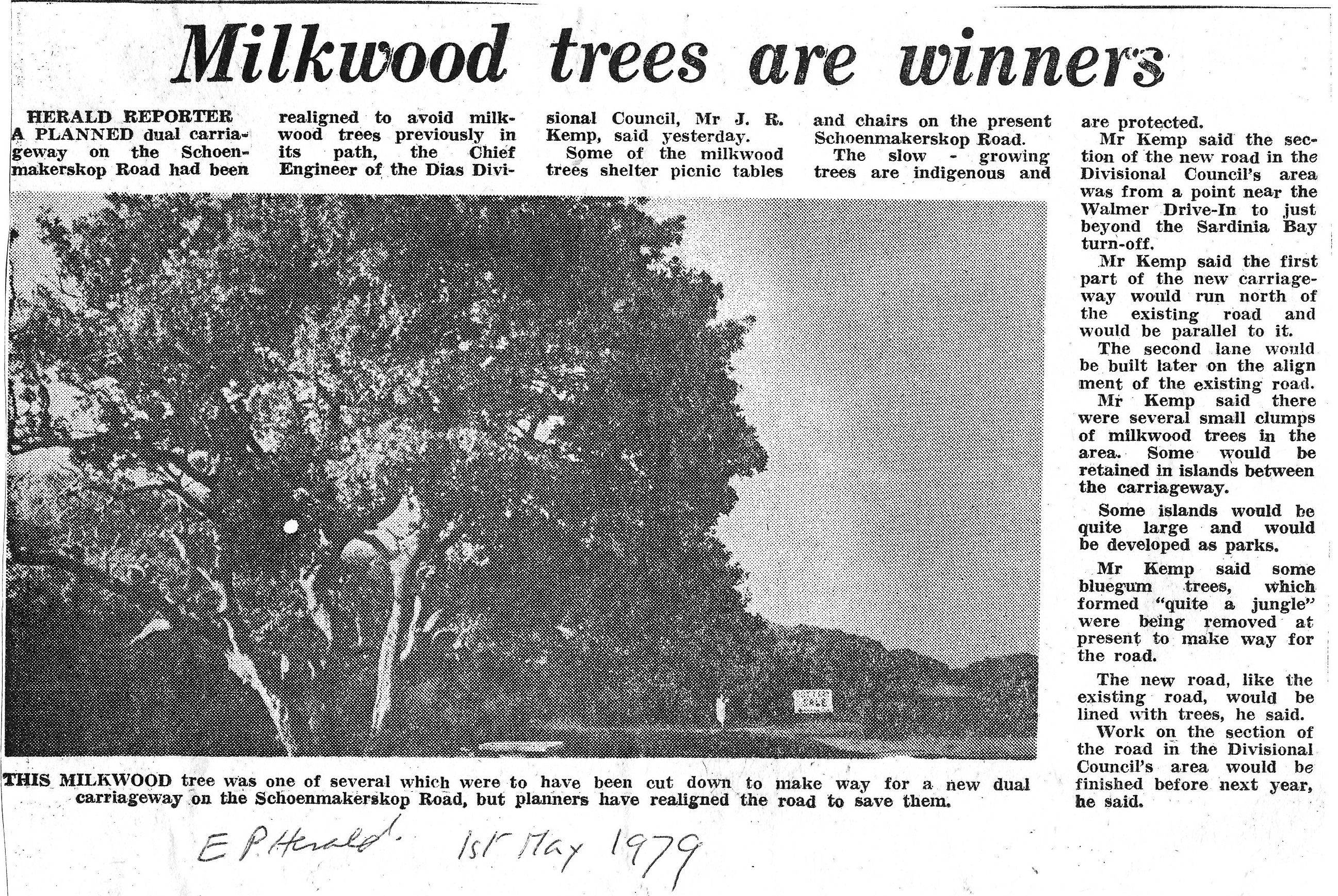 - Caption "This Milkwood tree was one of several which were to have been cut down to make way for a dual carriageway on the Schoenmakerskop Road, but planner have realigned the road to save them. E. P. Herald 1 May 1979."