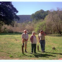 - Clearing at picnic-site with type of bush-forest Valley Bush in background, fluitjiesriet, Phragmites australis and Cape Willow, Salix capensis along the river. A one legged William Massyn, and Peggy Collins watching a Pieter Coetzee scratching his head in front.