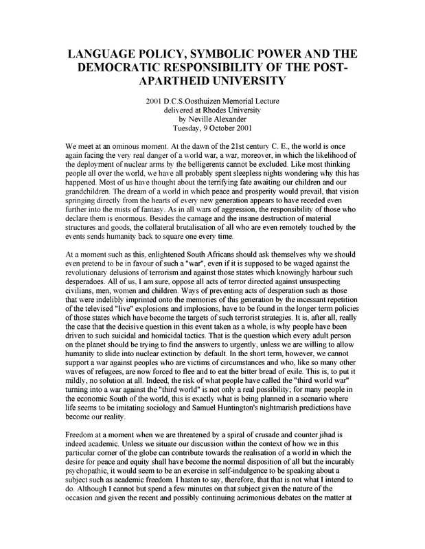 - Set against the backdrop of global instability following 9/11, Alexander examines the "symbolic power" of language in South African education. He argues that the post-apartheid university has a democratic responsibility to promote multilingualism to prevent the marginalization of the majority and to decolonize the South African mind.
