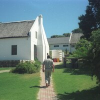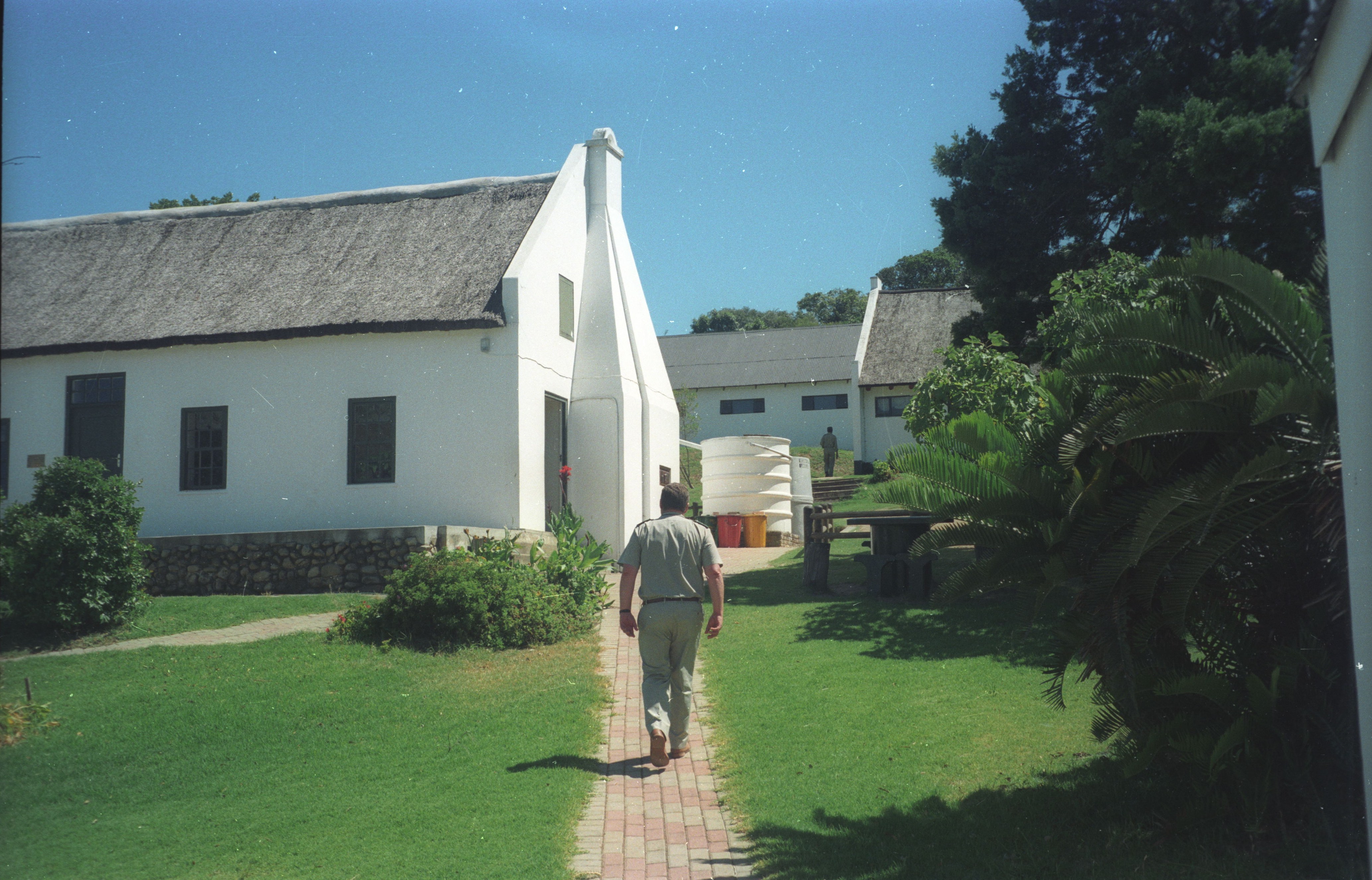 - PW Coetzee, Director of Nature Conservation, Western Districts Regional Council, walking up to the origional old thatched farmhouse (right) witrh other buildings beyond.