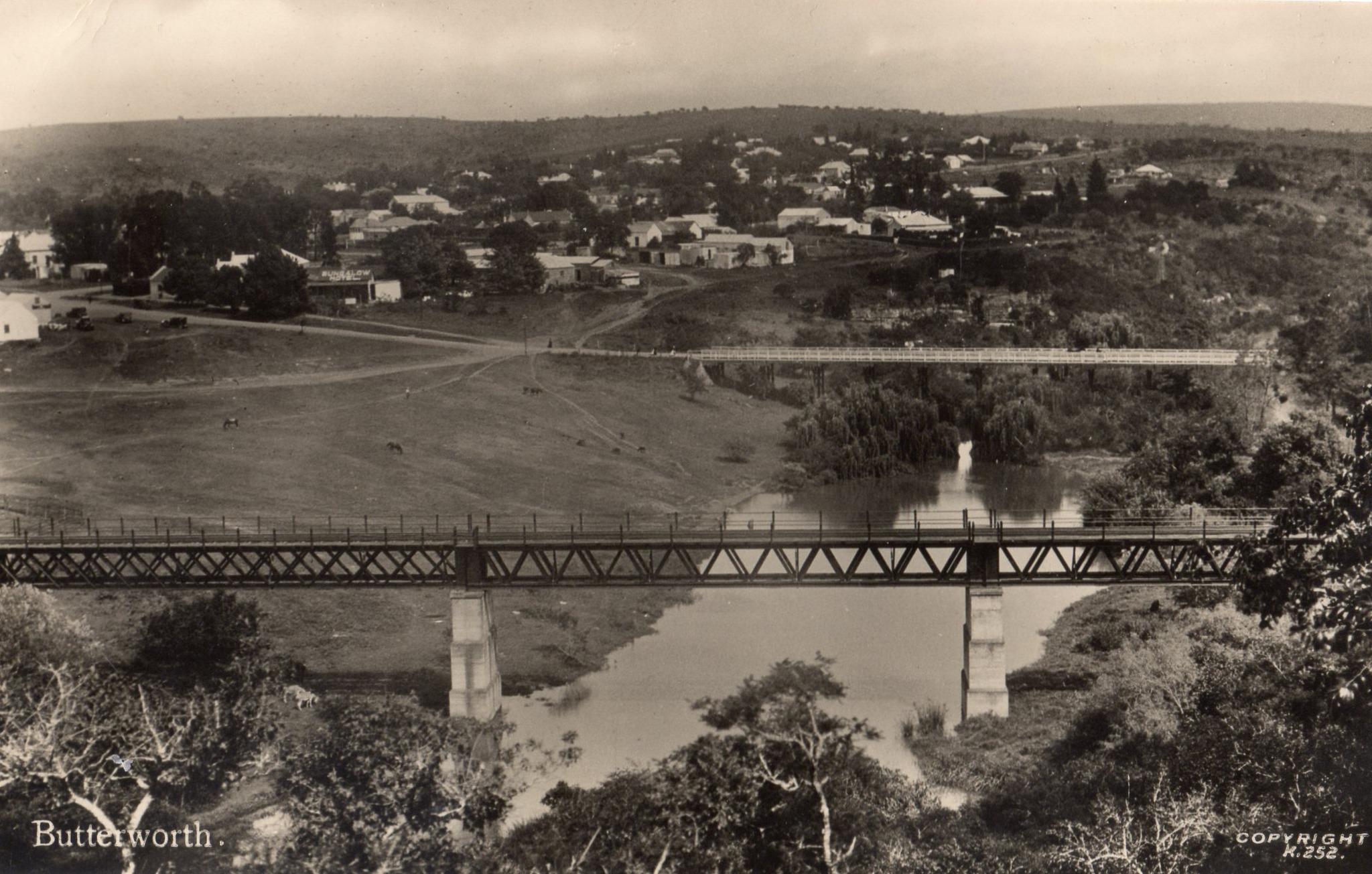 - A sepia-toned historical photograph showing a high-angle panoramic view of Butterworth (Gcuwa), South Africa. The foreground features a prominent steel truss railway bridge crossing a river, with a second, smaller wooden or lighter bridge visible further upstream. The town settlement is visible on the rolling hills in the background.