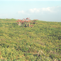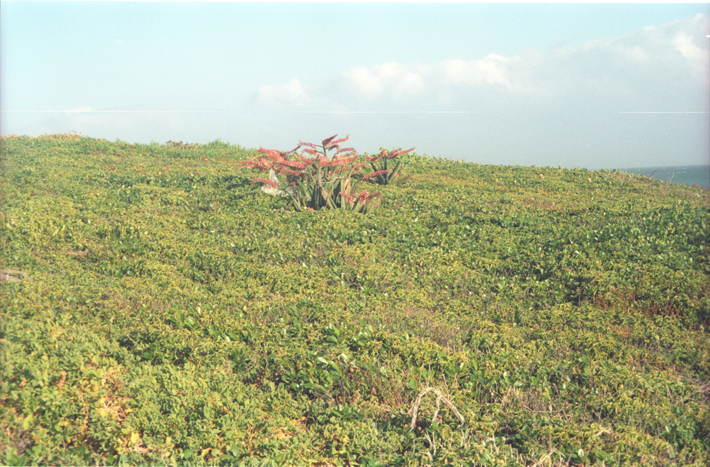 - Gasteria acinacifolia plants in dense woody coastal scrub heavily wind-blown.