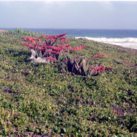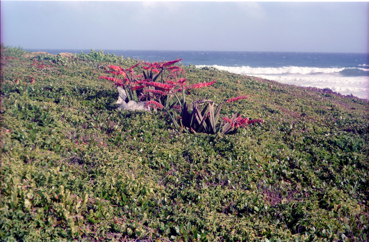 - Gasteria acinacifolia plants in dense woody coastal scrub heavily wind-blown. Complete with intruding plastic bag.
