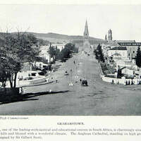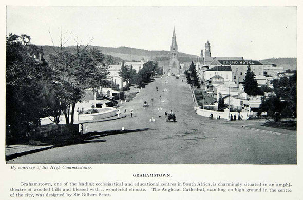 - A historical landscape photograph of Grahamstown, described in the caption as one of the leading ecclesiastical and educational centres in South Africa. The view shows the Anglican Cathedral, designed by Sir Gilbert Scott, standing on high ground in the centre of the city. The Grand Hotel is visible to the right. The city is noted for being situated in an amphitheatre of wooded hills.