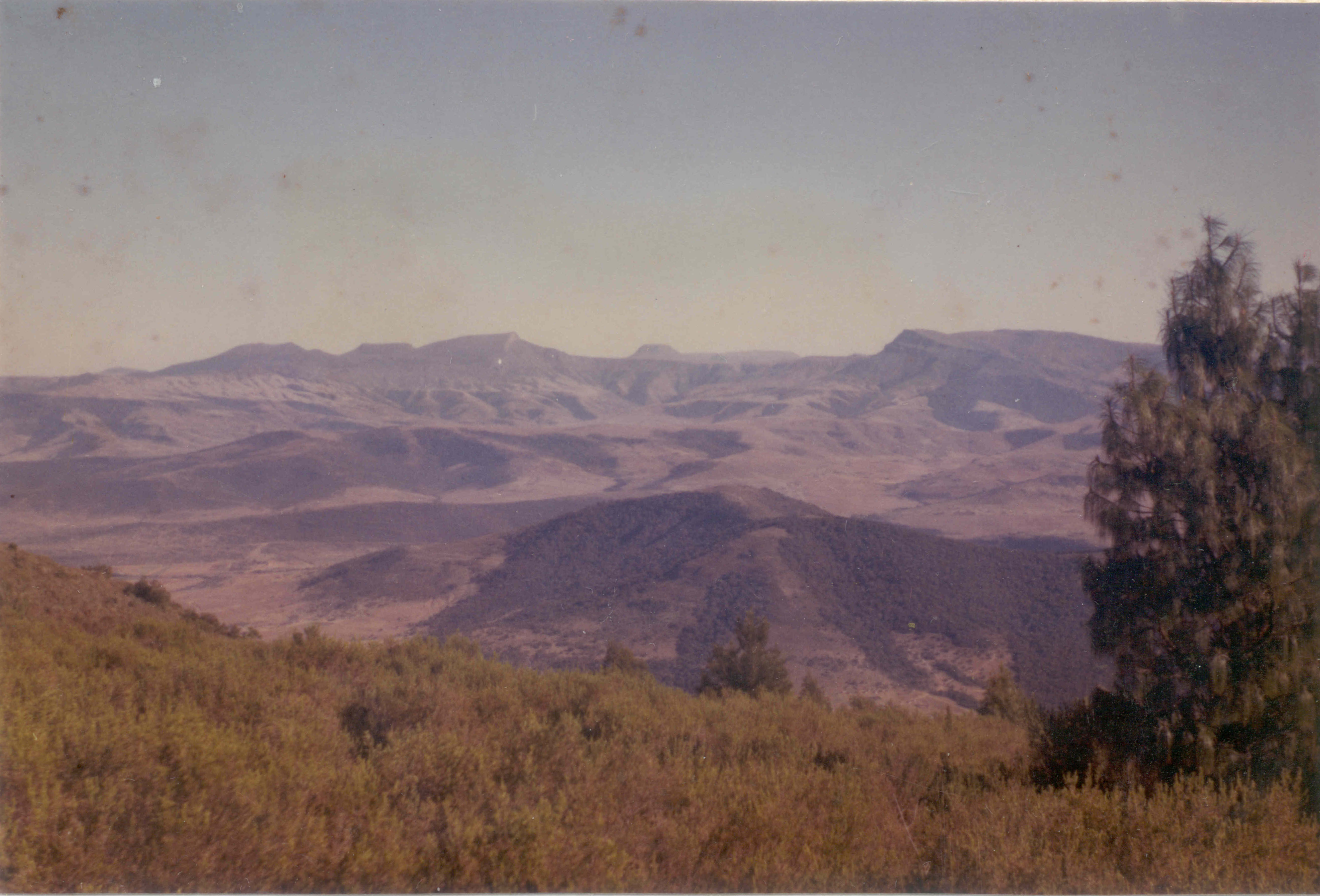 Looking across the Keiskamma basin from West Pirie Peak (Hoho Peak) to the three Hogsback peaks. To the left Bhukazana, centre Nguku (flat-top) and Mnyameni to the right