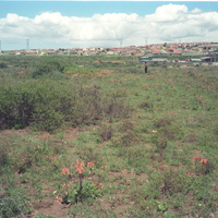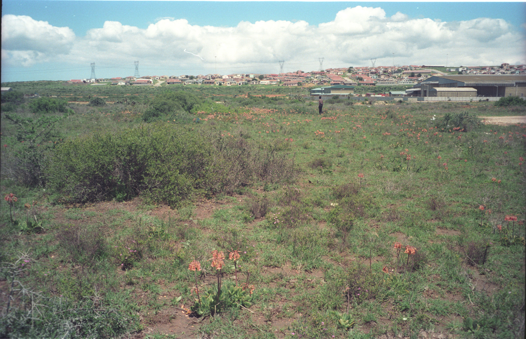 - Showing growth of Cotyledon orbiculta scattered over open veld not yet claimed as factory sites. Township of kwaMagxaki on hill in background.