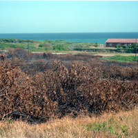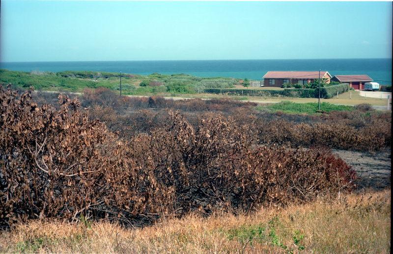 - Part of widespread burnout of veld. In foreground is Bitou, Chrysanthemoides monolifera, burnt a few days before, its dried leaves still attached. This same area was burnt out in 1986, twelve years ago but had recovered well.