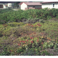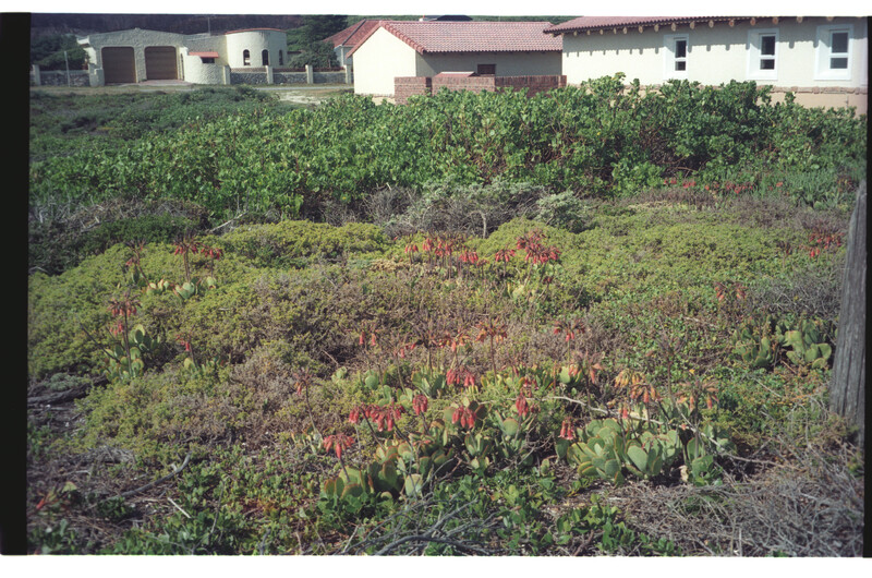 - Fine clusters of Cotyledon orbiculata in undisturbed veld. A mass in Bitou, Chrysanthomoides monolifera in immediate background.