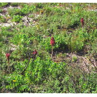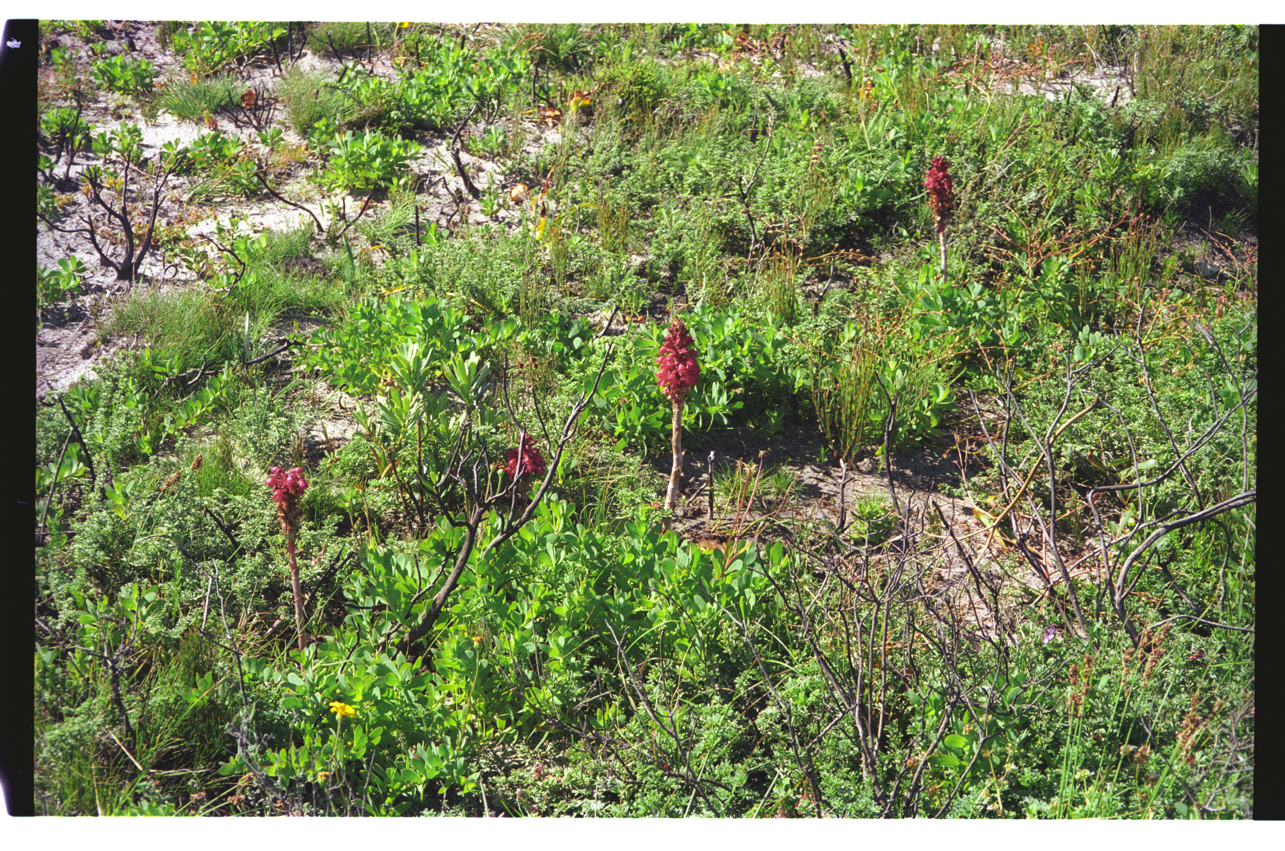 - Four fine Satyrium princeps in fresh herbage regrowth recovering from fire of nine months before. Note burnt remnants of fullgrown plants.