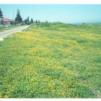 - Pure stand of Cotula coronopifolia on grassy verge. Other such displays nearby.