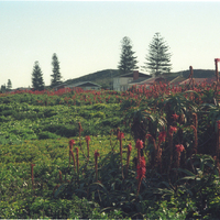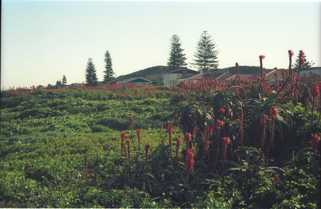 - Schoenmakerskop houses with their characteristic Araucaria monkey-puzzle trees backed by the two kops. The Aloe arborescens plants in the bushiness of the foreground cliff-shelf have been introduced.