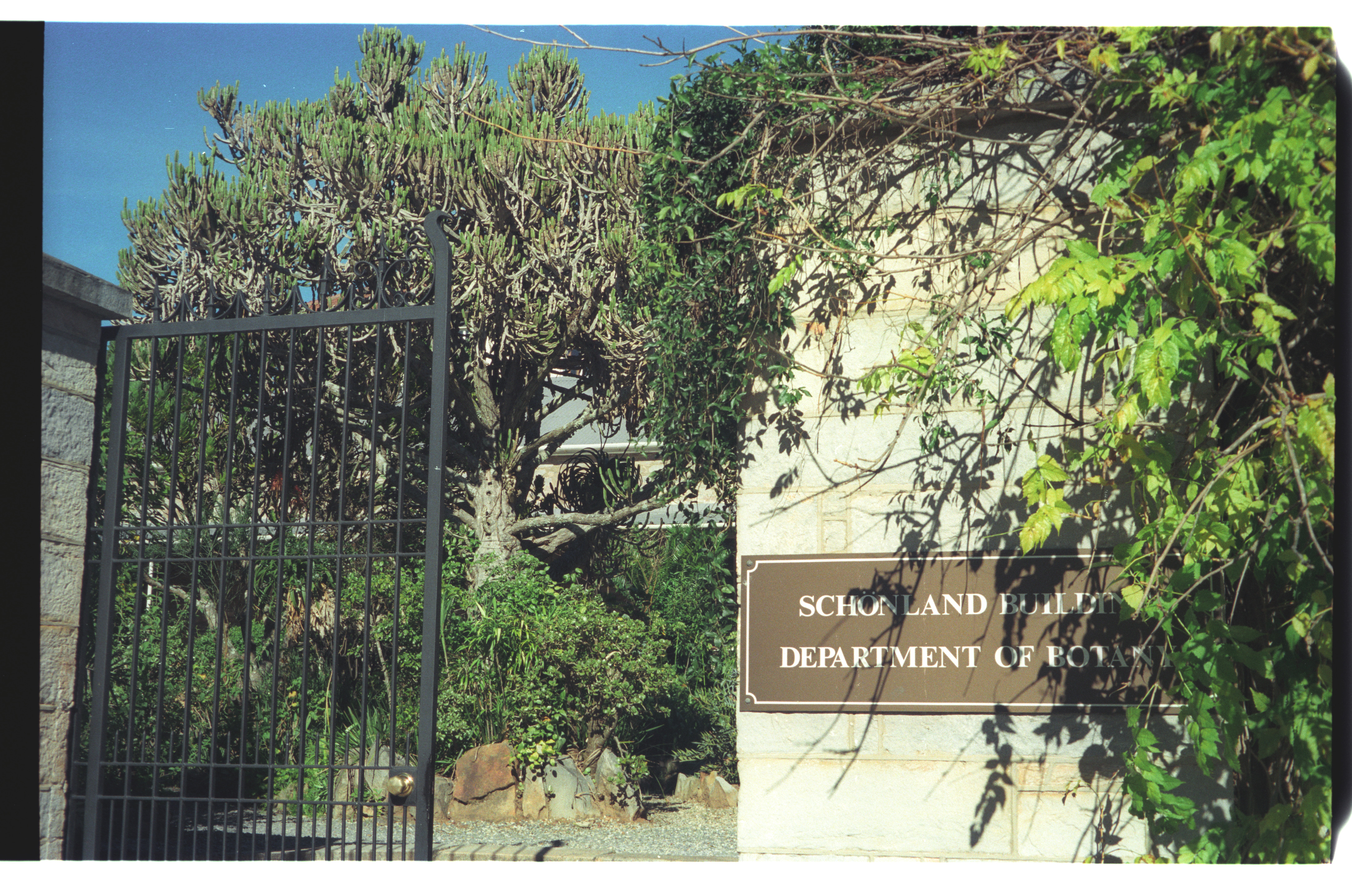 Skead, C. J. (Cuthbert John), “Entrance to Schonland Building (National Monument), Botany Department, Rhodes University, Grahamstown”, 1998-04-29, Cory Library and Historical Archives, accessed 29 December 2025, https://digitalarchives.ru.ac.za/s/cory/item/2436