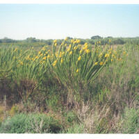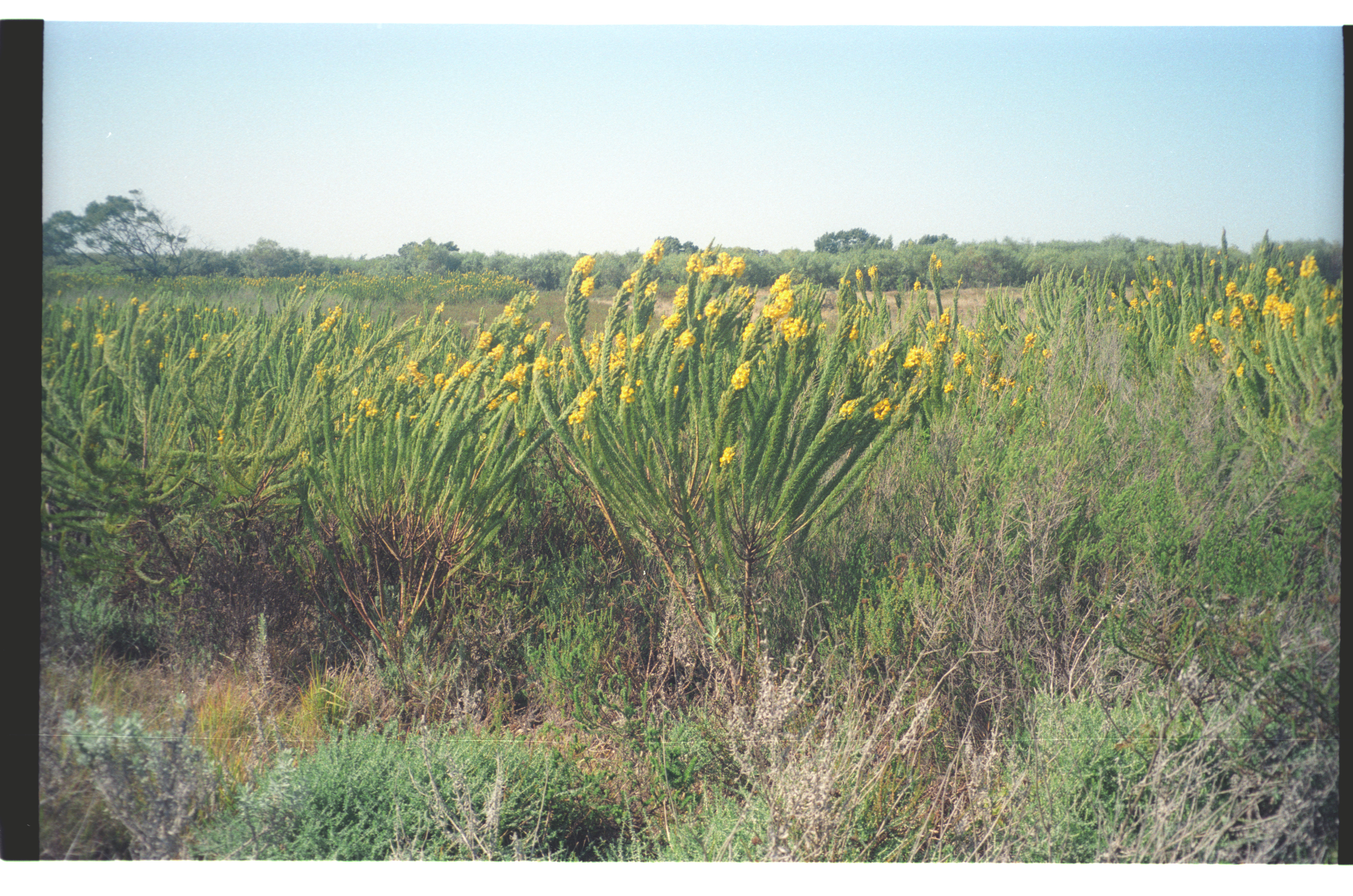 - Cyclopia pubescens in damp area after good winter rains. Apparently not seen thus annually. Beneath aborted overhead road construction. Found in two large fields, the other visible in the background.