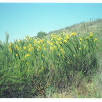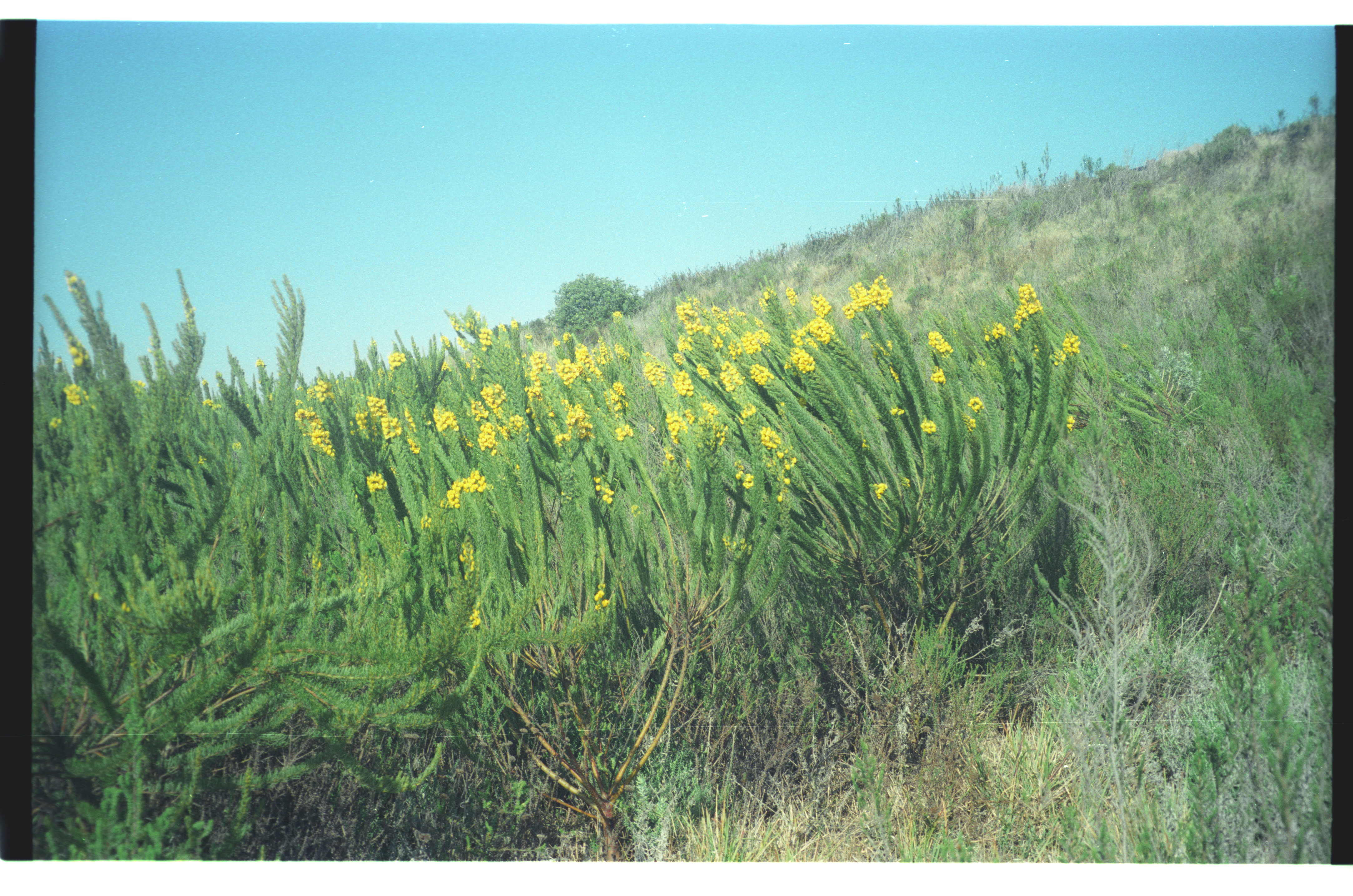 - Cyclopia pubescens in damp area after good winter rains. Apparently not seen thus annually. Beneath aborted overhead road construction, part of which in background.