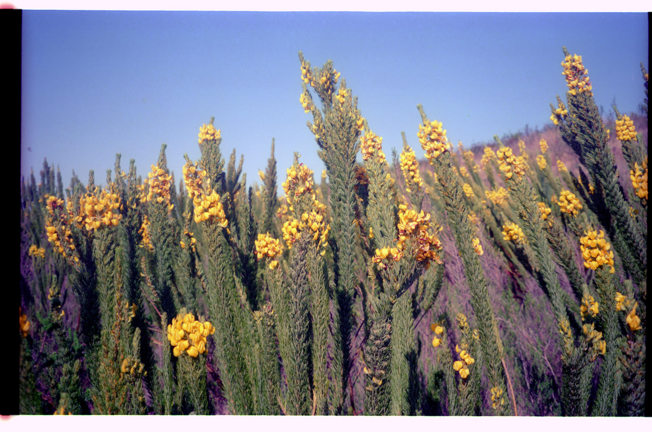 - Cyclopia pubescens in damp area after good winter rains. Apparently not seen thus annually. Beneath aborted overhead road construction. Part of one of two such fields of the plant.