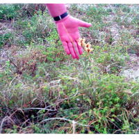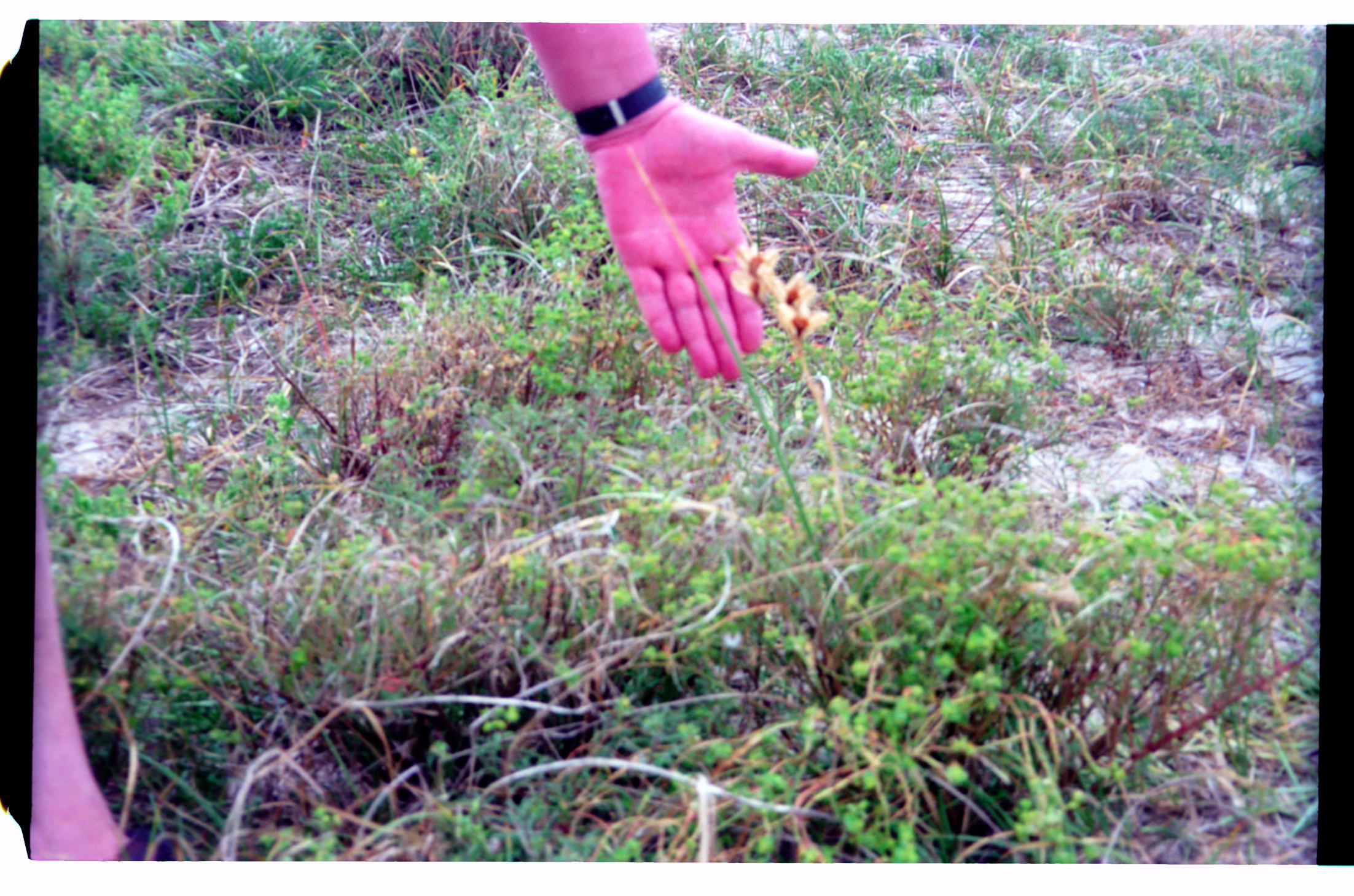 - Hand points to seeding Gladiolus guenzii at end of flowering season. Not good ground cover around this plant, all growing in dune sand.