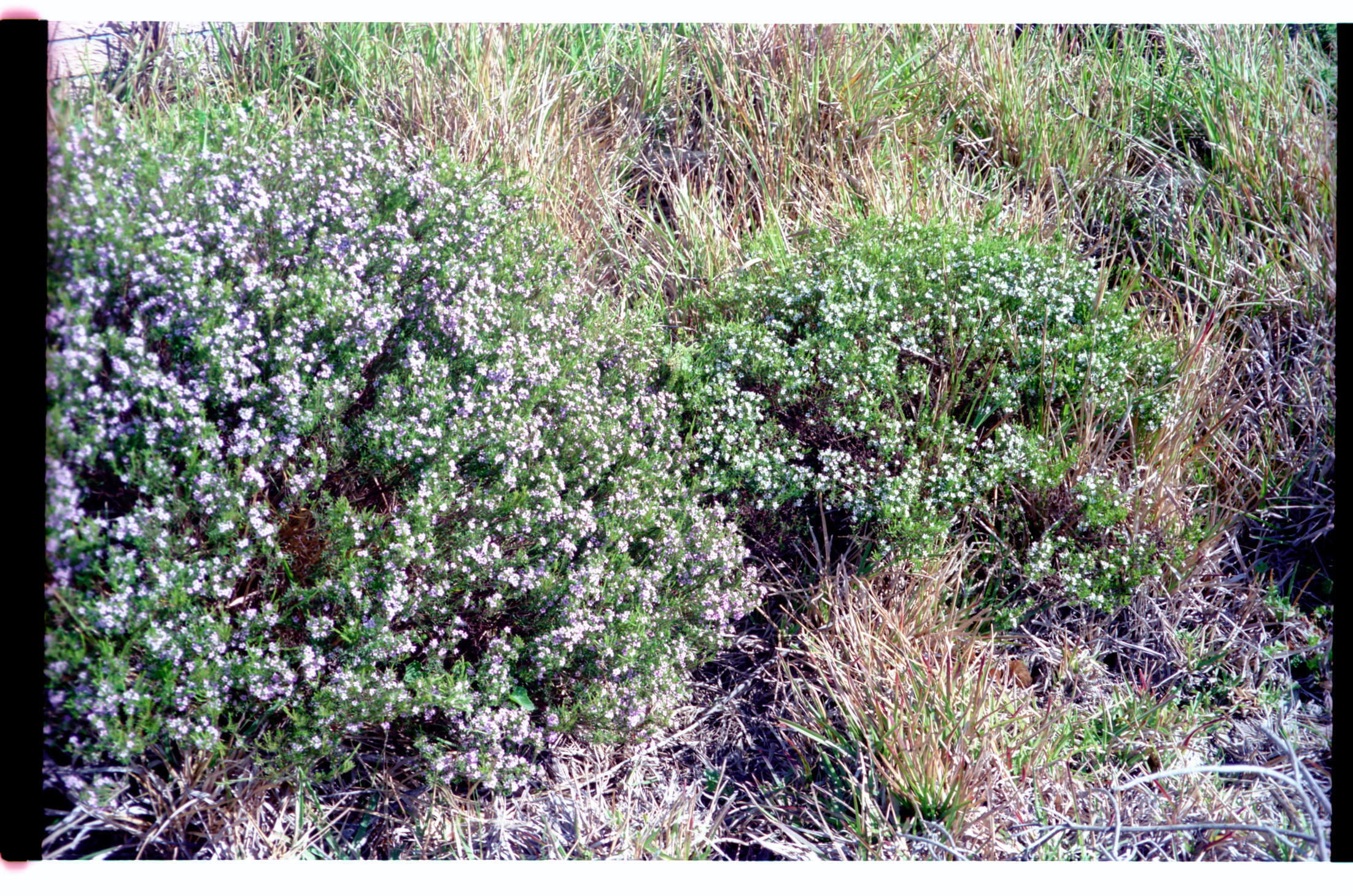 - Two individual plants of Coleonema pulchellum side by side in two colours. Pale pink-flowered on the left, pure white flowered on the right. The pink form was dominant in the area, although not well reproduced in the colour print.