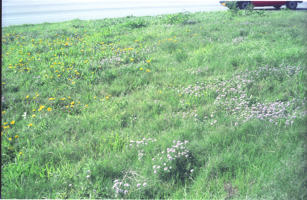 - Patch of about 17 Sutera campanulata plants (pale blue) in long grass on roadside towards Univ. Port Elizabeth. Free flowering Gazania krebsii at left of photo.