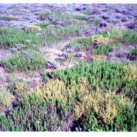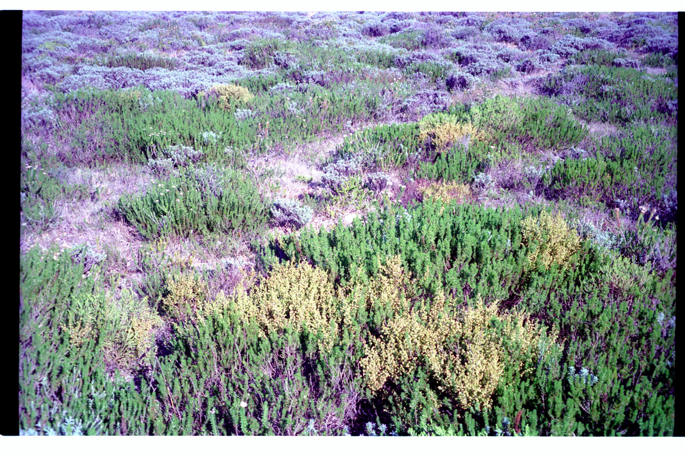 - Plants of Erica glumiformis (pale yellow) flowering on an open 'heathy' fynbos area - on land soon to dissappear under urban development. Such veld was typical of this part of the coastline south of Port Elizabeth prior to Summerstrands development.
