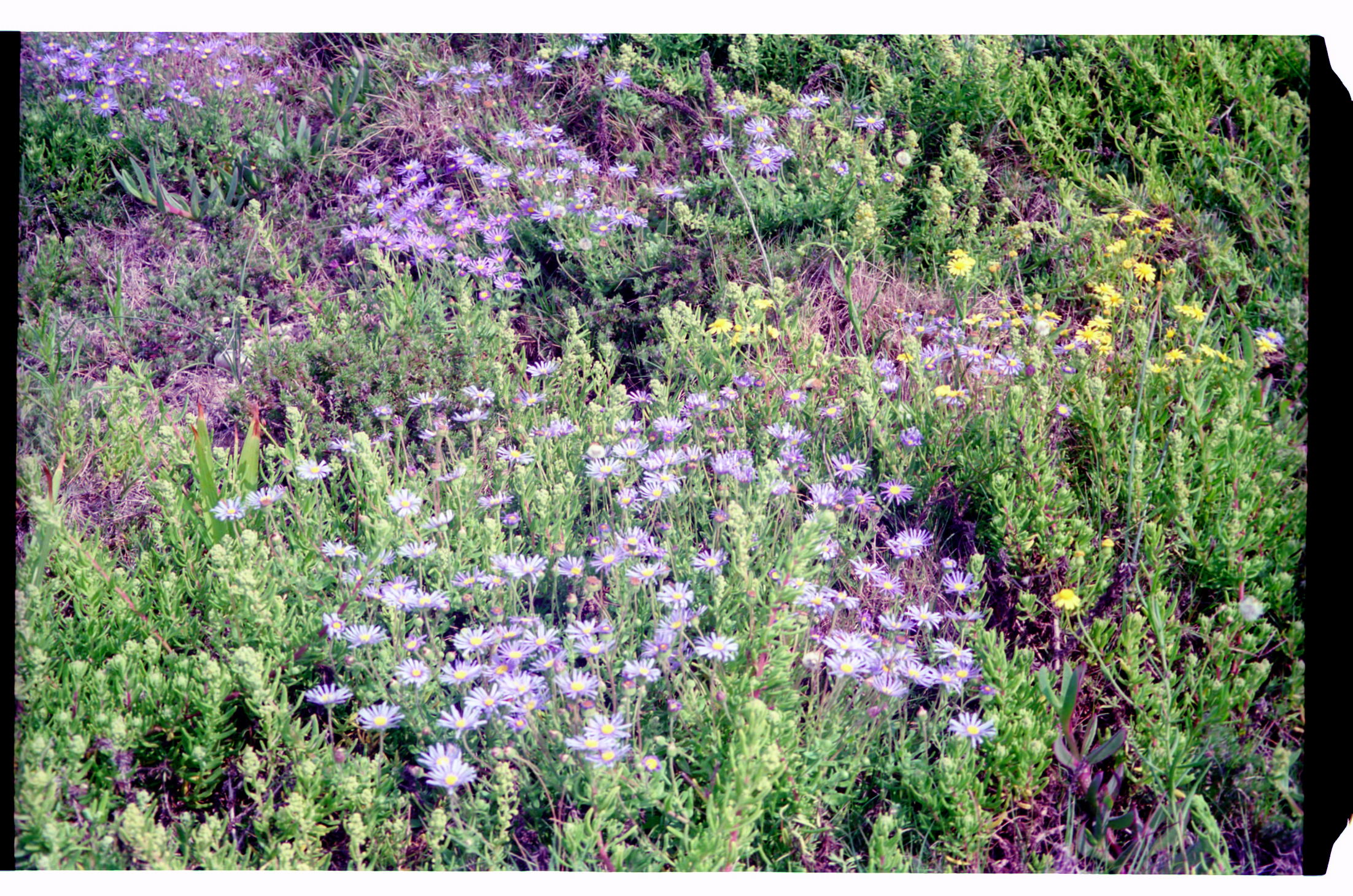 - Felicia amoena in roadside herbage on sand. Very showy now everywhere after good winter rains.