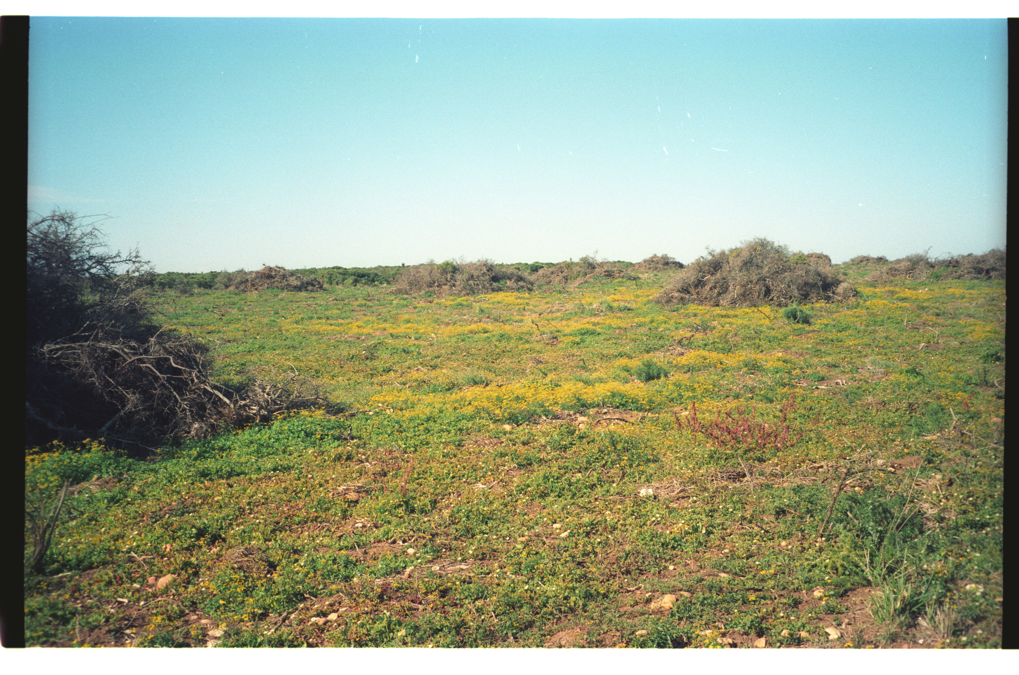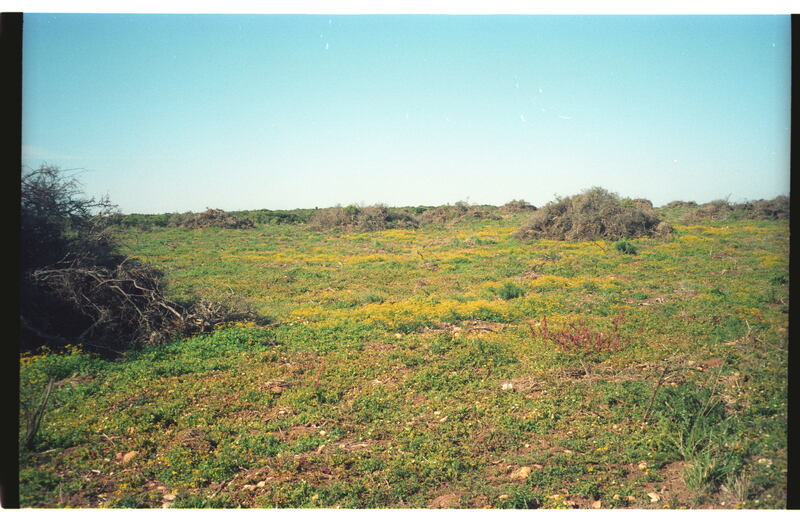 - Yellow-flowering Cineraria lobata. En mass as pioneer after dense bushveld cleared for housing estate. Note line of original bush cover in background. Mesembryanthemum cover had also come in.