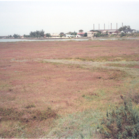 - Chimneys of Municipal Power Station in background. Salicornia in red colour phase.
