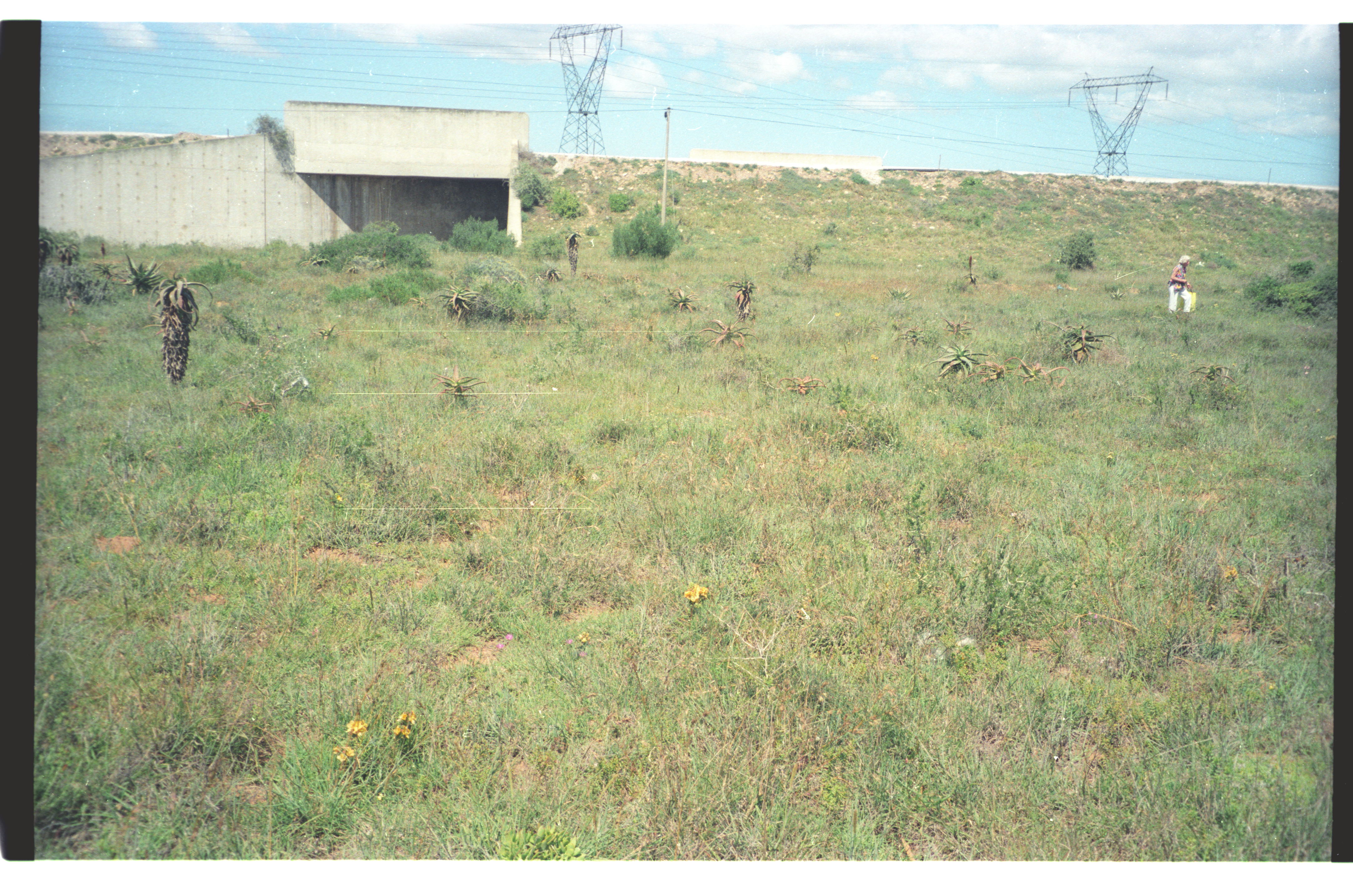 - Typical grassveld, with patches of dense thorny scrub-bush growing nearby. Plants of yellow Alectra capensis visible. Swartkops-Uitenhage road in background passing over railway sideline to factory sites beyond. This area due for destruction under urban development.
