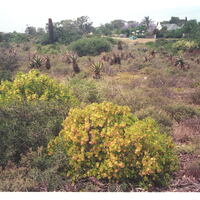 - 2 plants of Zygophyllum morgzana with display of yellow seedpods giving initial imprression of flowers. Probably be put under housing in the future.