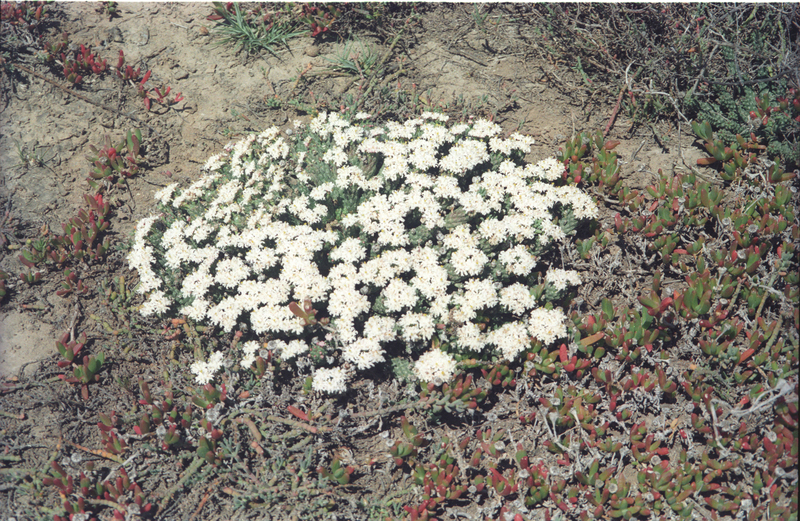 - An exceptionally fine stool of Vingerpol in full, fine, flower, Euphorbia inerme. Surrounded by Salicornia leaves in the red phase.