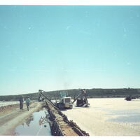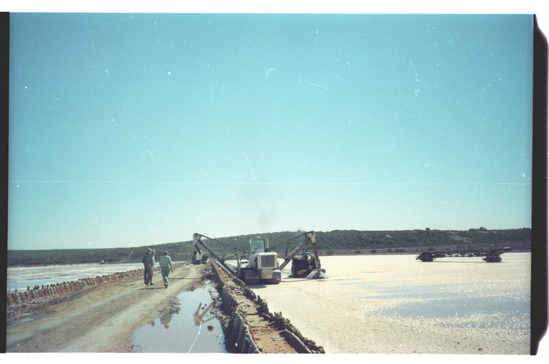 - Harvesting a layer of salt by scooping and delivering by conveyor-belt into waiting truck. Looking north to heavily bushed hillside.