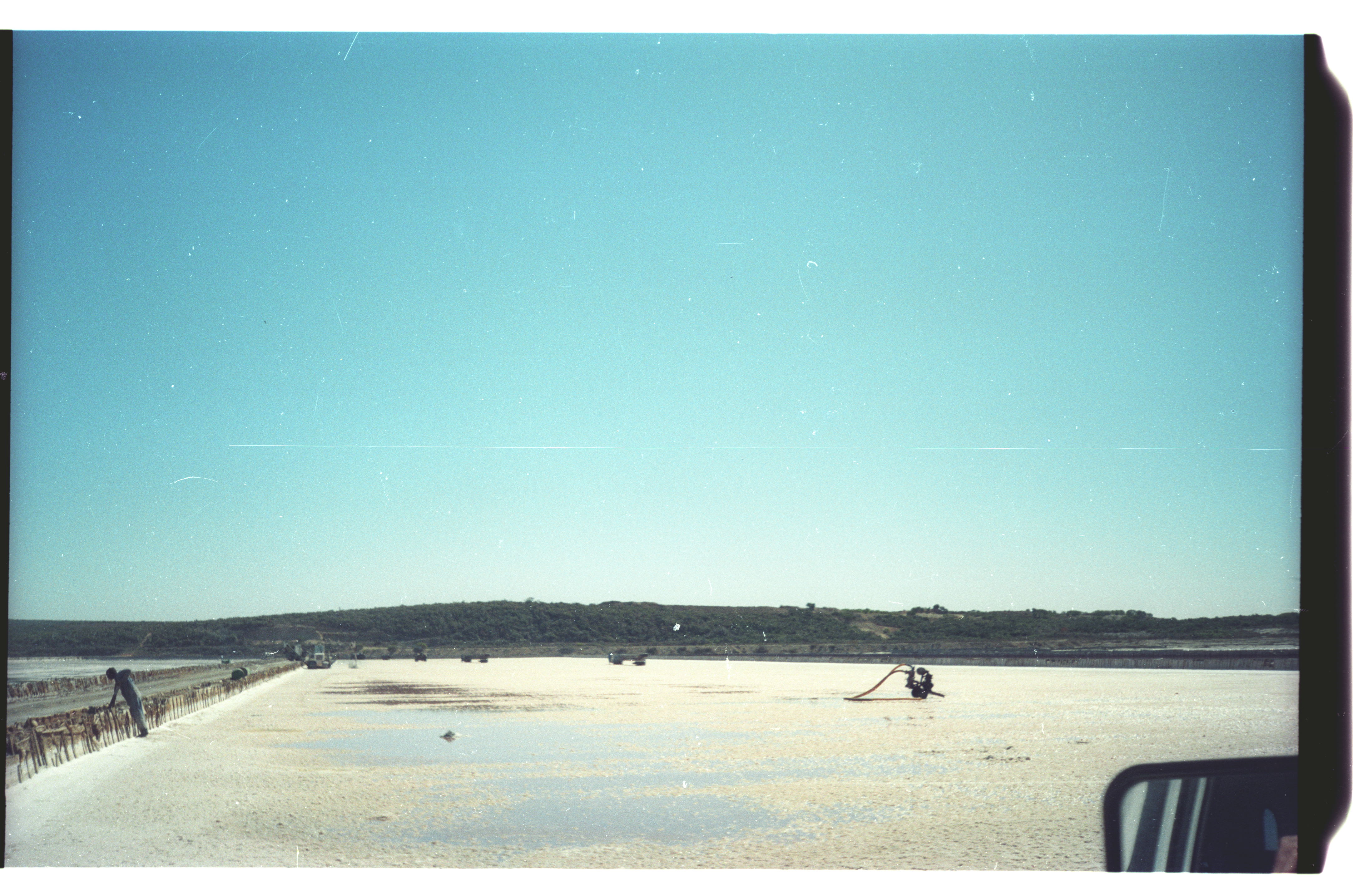 - Accumulation of salt ready to be harvested. Note machine at work biside roadway in distant left.