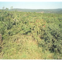 - Single Pelargonium inquinans in full flower. Note density of surrounding bushveld and the height of this plant where the general upper level is about 2 metres and more.