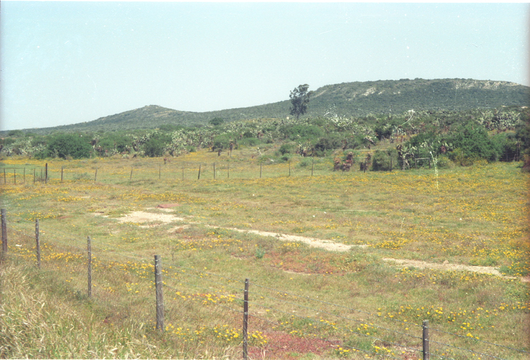 In background, the two high points Uitenhage Springs Reserve, Kleinkop on left, Grootkop on right with farmland & roadside prickly-pear thickets between
