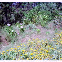 - Mixed flora near entrance. Yellow composites in foreground; Protea cynaroides and Watsonias in background against shrubbery.